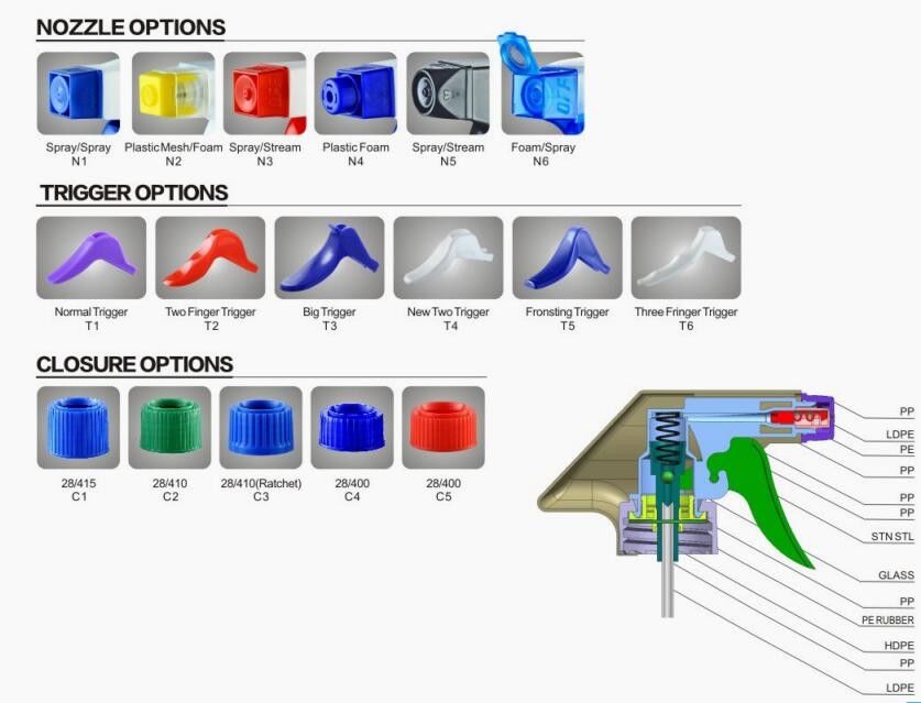 이 고품질 트리거 분무기는 다양한 노즐 옵션을 가지고 있습니다. 제품은 폼, 분사 또는 스트림 형태로 분사될 수 있습니다.